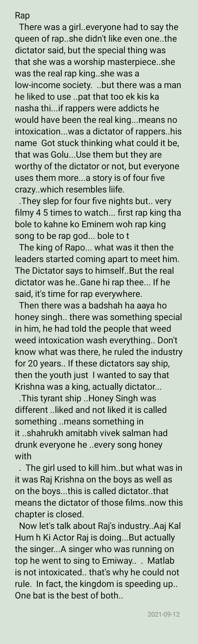 There was a girl..everyone had to say the queen of rap..she didn’t like even one..the dictator said, but the special thing was that she was a worship masterpiece..she was the real rap king..she was a low-income society. ..but there was a man he liked to use ..pat that too ek kis ka nasha thi…if rappers were addicts he would have been the real king…means no intoxication…was a dictator of rappers..his name Got stuck thinking what could it be, that was Golu…Use them but they are worthy of the dictator or not, but everyone uses them more…a story is of four which… 4 5 times to watch… first rap king tha bole to kahne ko Eminem woh rap king song to be rap god… bole to t